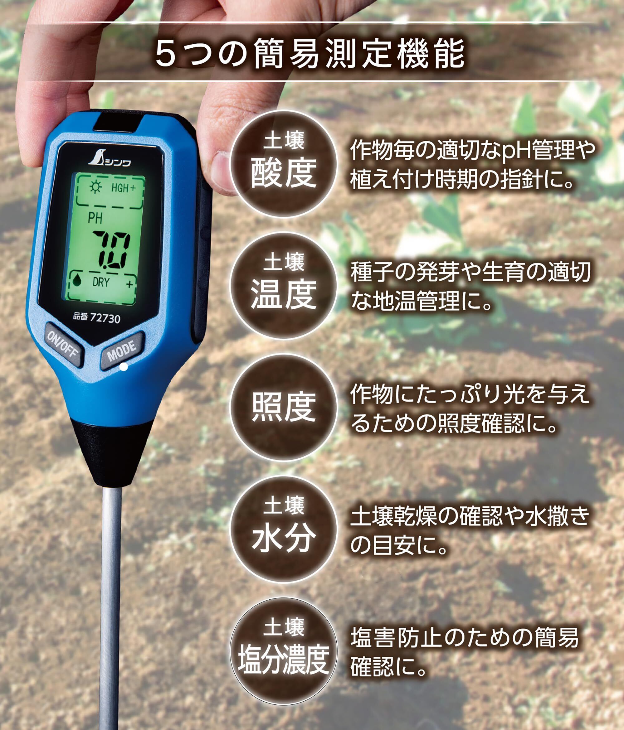土壌酸度(pH)以外にも土壌の温度、塩分濃度、水分、照度が簡易測定できる土壌酸度計です。