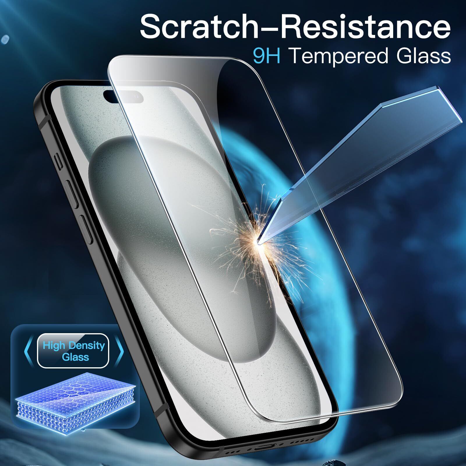 JETech 3 in 1 iPhone 15 6.1 インチ用 マットケース 2枚強化ガラスフィルム付き 半透明 つや消し 耐衝撃スマホカバー (ブラック)