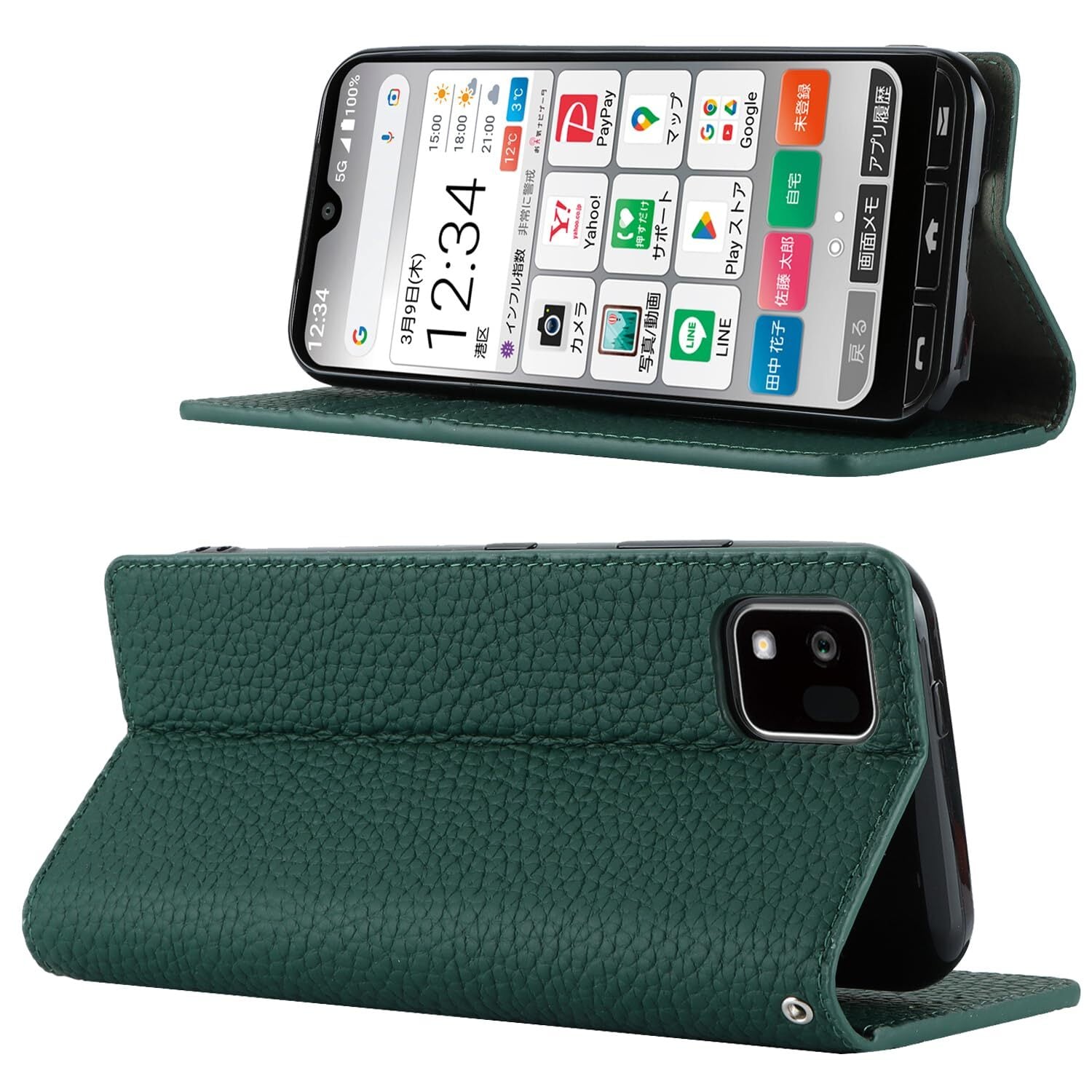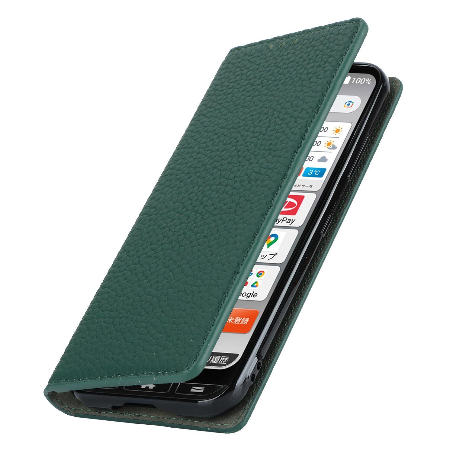 for 京セラ かんたんスマホ3 A205KC ケース 本革 牛革 for 京セラ A205KC 簡単スマホ3 手帳型 カバー Case 柔らかい 本皮 スプラットホール付き スプラット同梱 内蔵マグネット - ダークグリーン
